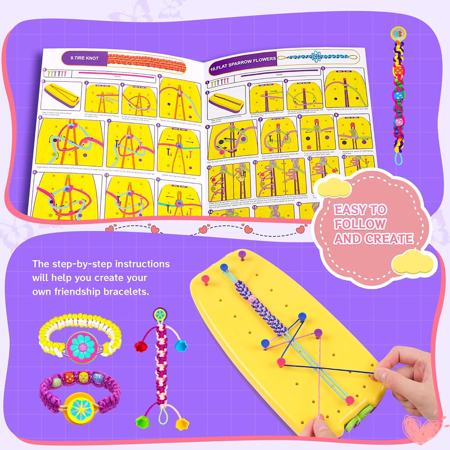 2024 Newest Upgraded Complete Crafting Kit includes everything your child needs for endless creativity. It comes with 1 gift packing box, 1 portable bracelet loom, necessary accessories and step-by-step instructions. Kids DIY on the friendship bracelet making loom and make their own unique style according to their preferences. Such as fashionable bracelets, key chains, bag pendants, hair braids in their own style to advance children interesting and hobbies of craft. Fashionable string friendship bracelet making kit is a perfect gift for girls aged 6 7 8 9 10 11 12. Different styles of bracelets for girls to wear a week without repeating.