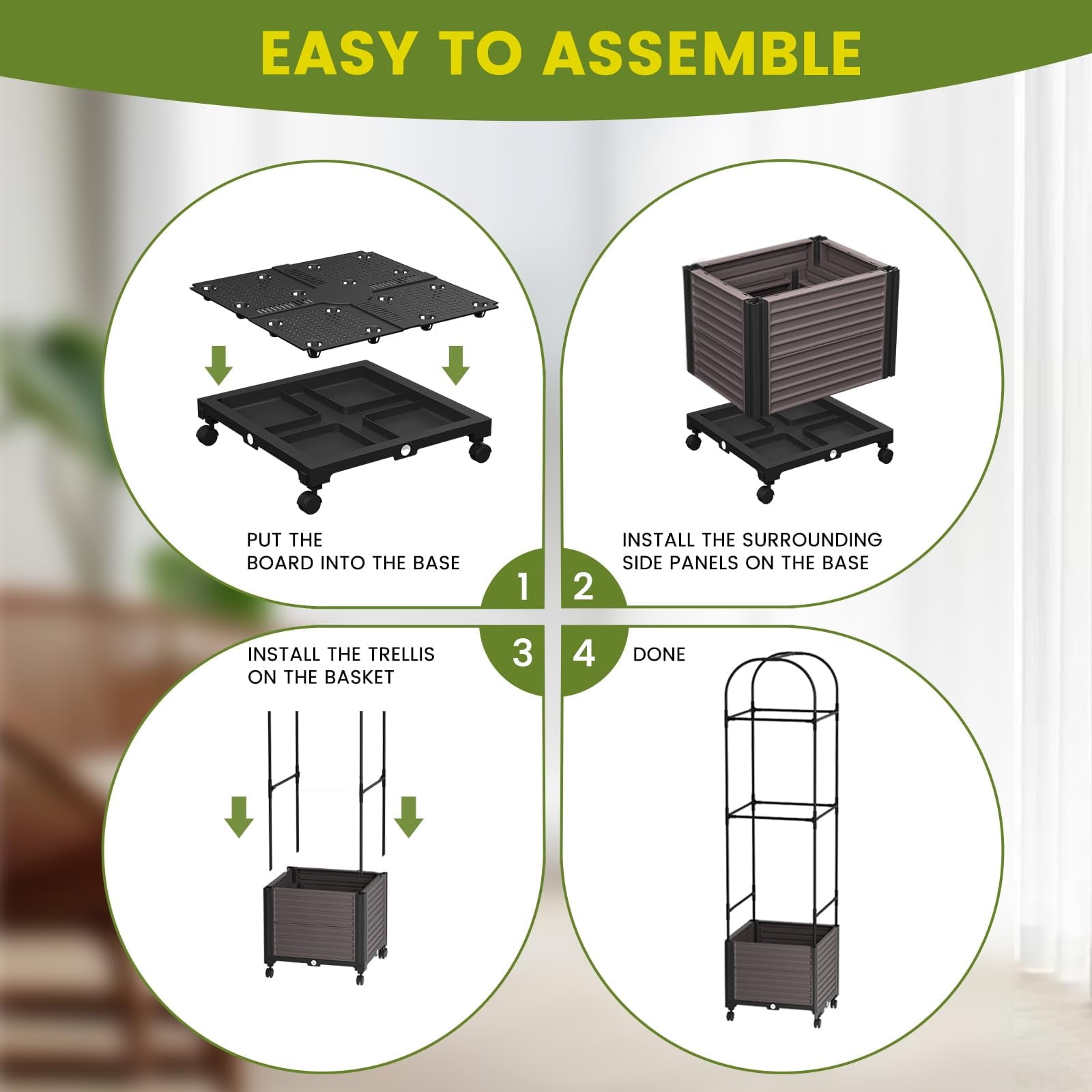 If you want to create the garden you've been dreaming of, KORALAKIRI planter trellis with wheels is a good choice. The total height is 61" and consists of a large planter box measuring 16*12*16 inch in length and width and a trellis frame measuring 45" high, gives you enough room and great support for your favorite climbing plants, and also adds a decorative effect. The self watering planter are made of weather-resistant material, suitable for outdoor use, plus it's washable and easy to clean. Come with 4 lockable Swivel Casters, you can move it around for better photosynthesis or shade. Get this Garden Trellis for outdoor, enjoy the benefits of gardening and healthy, fresh produce with less effort!