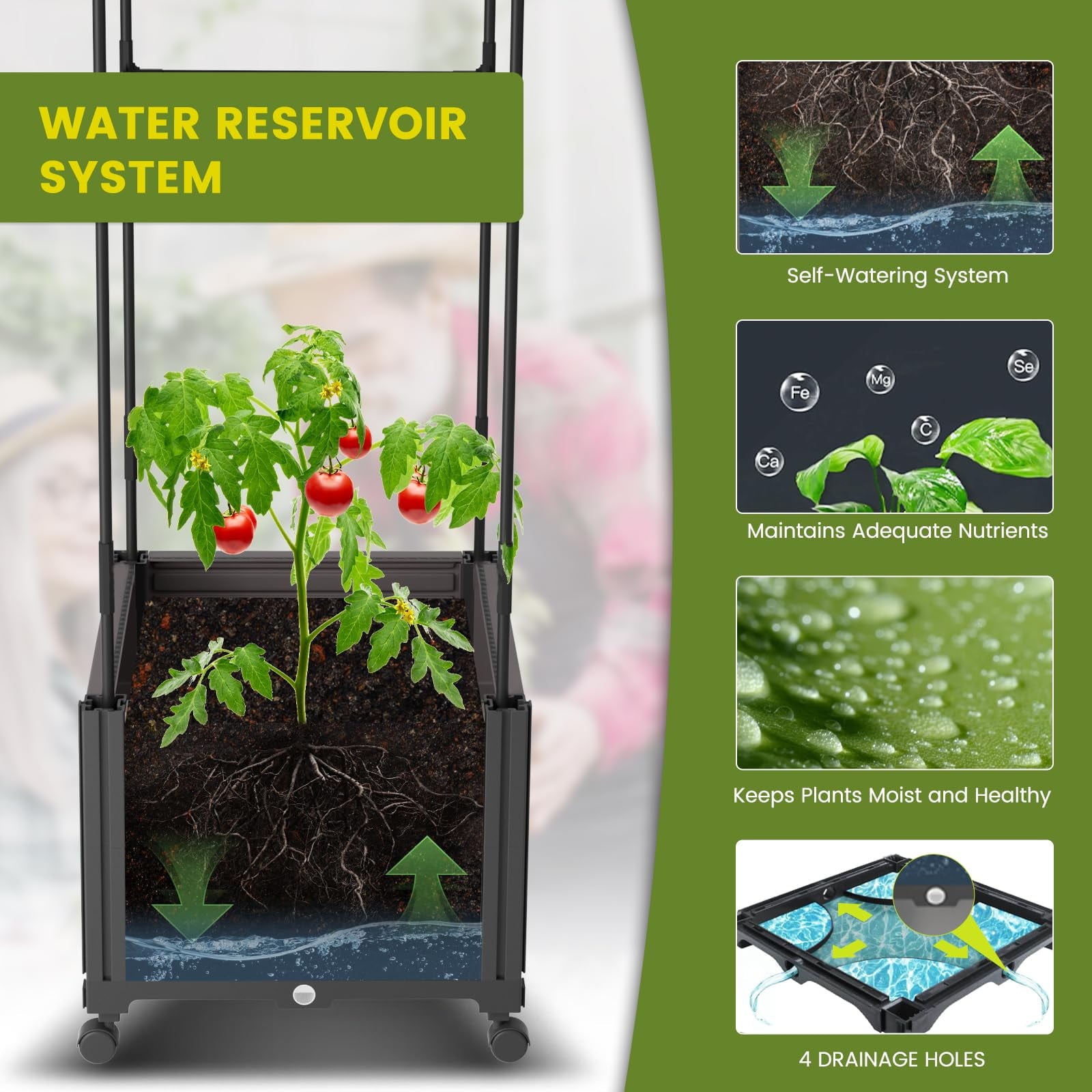 - Self-Watering System: Our tomato planter watering system means less hassle for you. The planter box with trellis hydrates plants from below, while water plugs can also be removed to drain excess water to prevent root rot and keep the soil fresh. Ideal for urban spaces and patio gardens!
