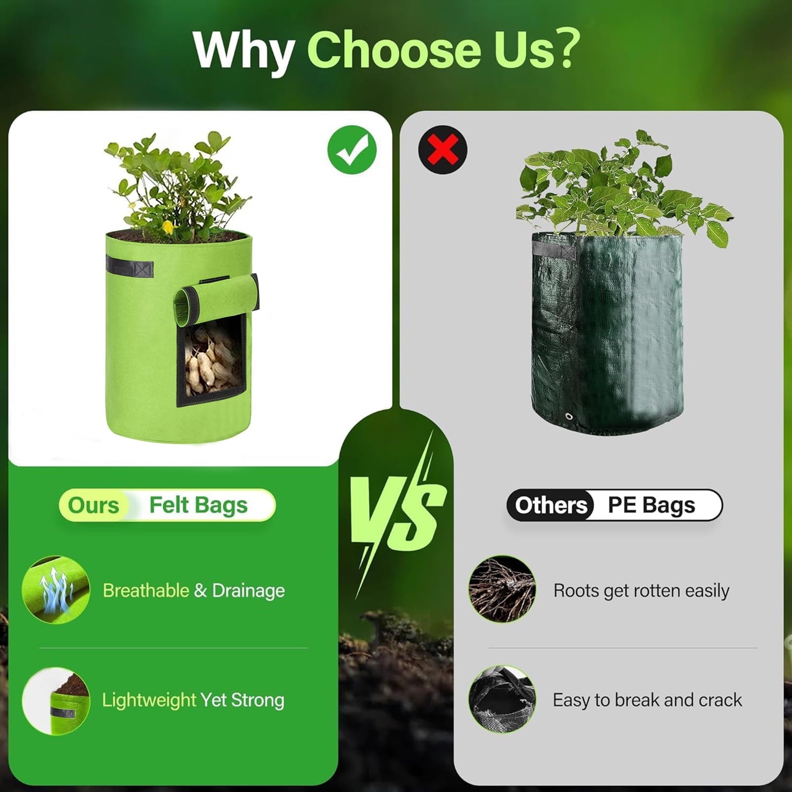 Our 10 Gallon Potato Grow Bags are made of thickened felt material, heavy duty and durable, lightweight and breathable, will not pollute the environment and affect the quality of vegetables. Simply place them on your patio or yard and fill with fresh soil. You can plant flowers, vegetables, fruits, small trees and so on.
