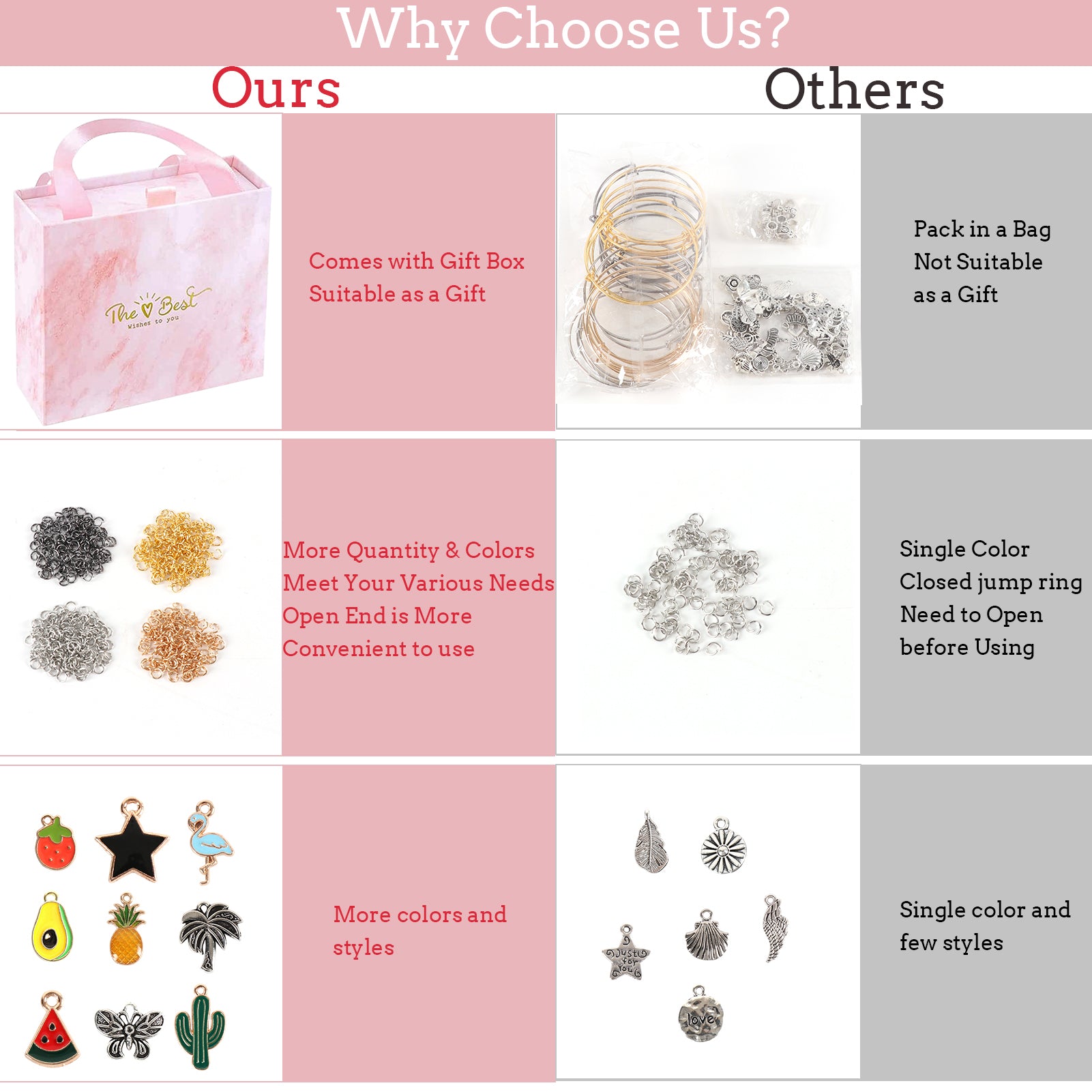 715pcs great value set: Charms bangle bracelet kit contains 30pcs colorful metal charms, 50pcs silver metal charms, 600pcs open jump rings (4 colors), 10pcs connecting beads and 5pcs drawcords for a necklace, plier, gift box Assorted styles: Four colors for bangles jump rings(gold/rose gold/silver/antique nickel), multiple colors for necklace drawcord. You can make a total different Size adjustable: Bangle's original inner size is 6.5cm, but you can adjust it from 5.5cm to 7.5cm and extend the necklace drawcord from 43cm to 48cm. The flexible size is suitable for most girls.