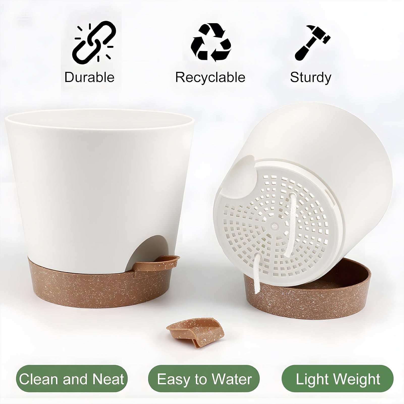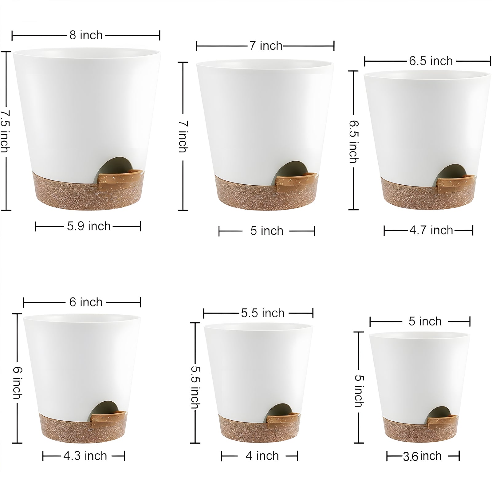 West Bay 6-Pack Self Watering Planters, Indoor Outdoor large flower pot plant pots with Drainage Holes and Saucers, 8, 7, 6.5, 6, 5.5, 5 Inches, White