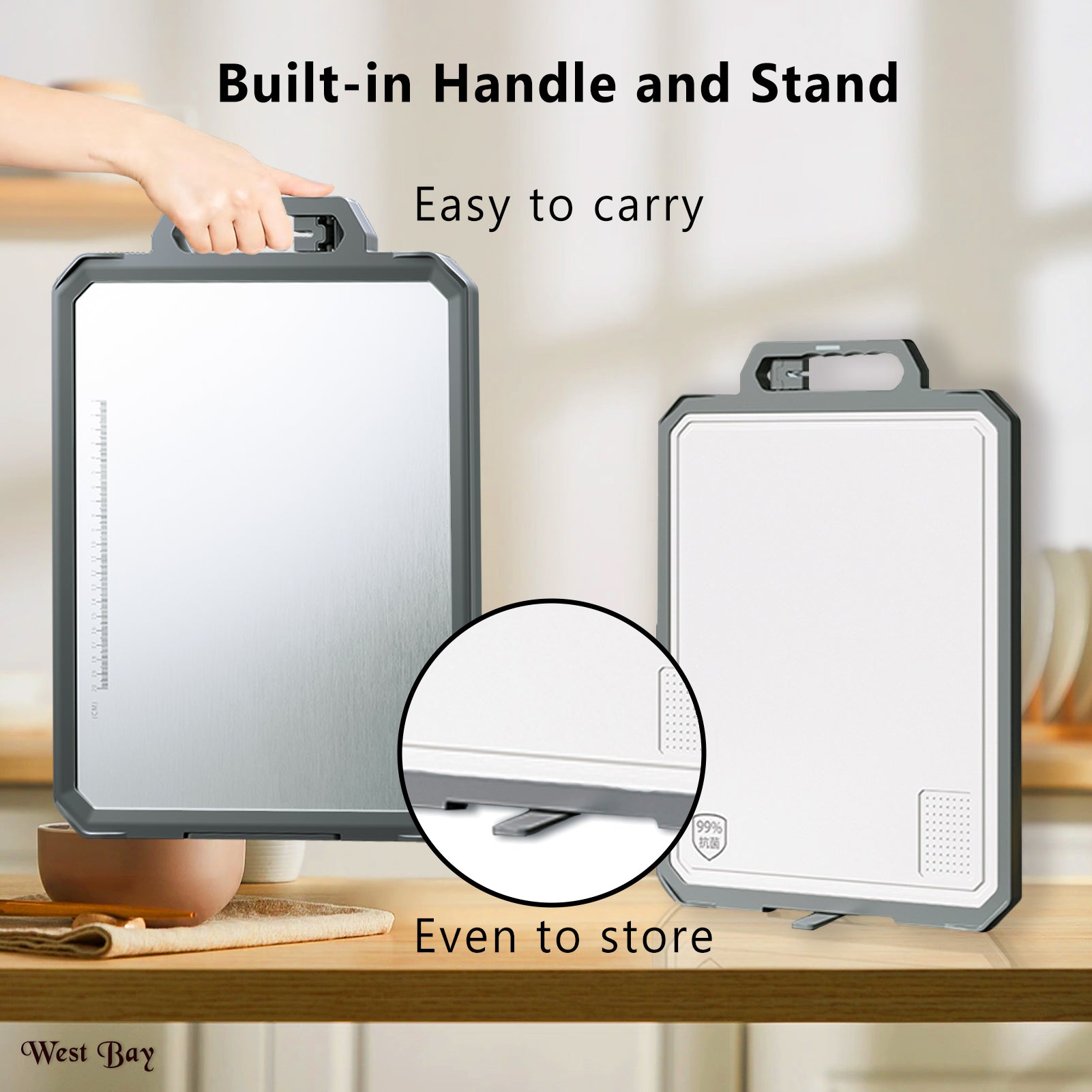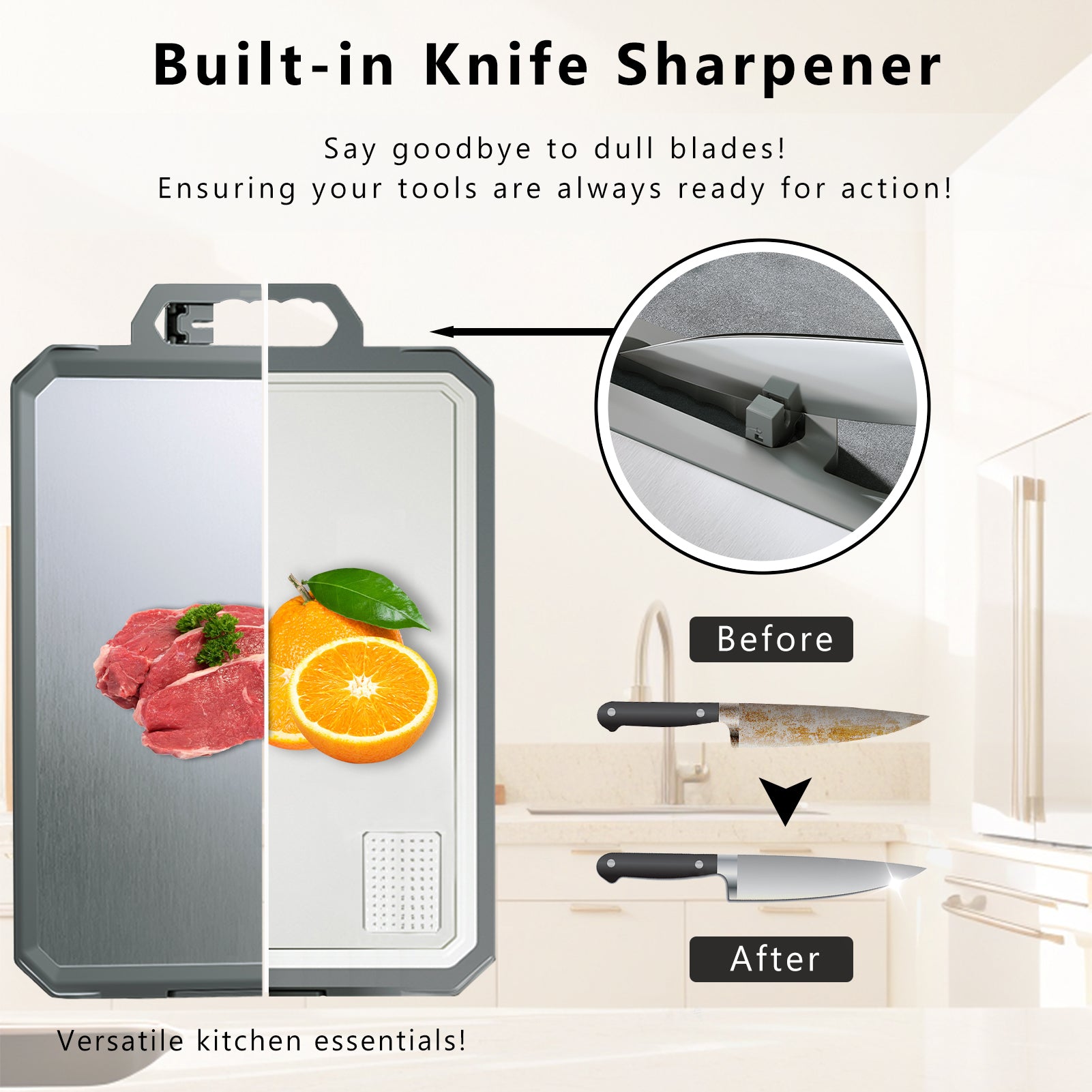 - Versatile Design: Featuring a double-sided design with a stainless steel surface for meat and a PP side for fruits and veggies, this cutting board offers kitchen versatility.