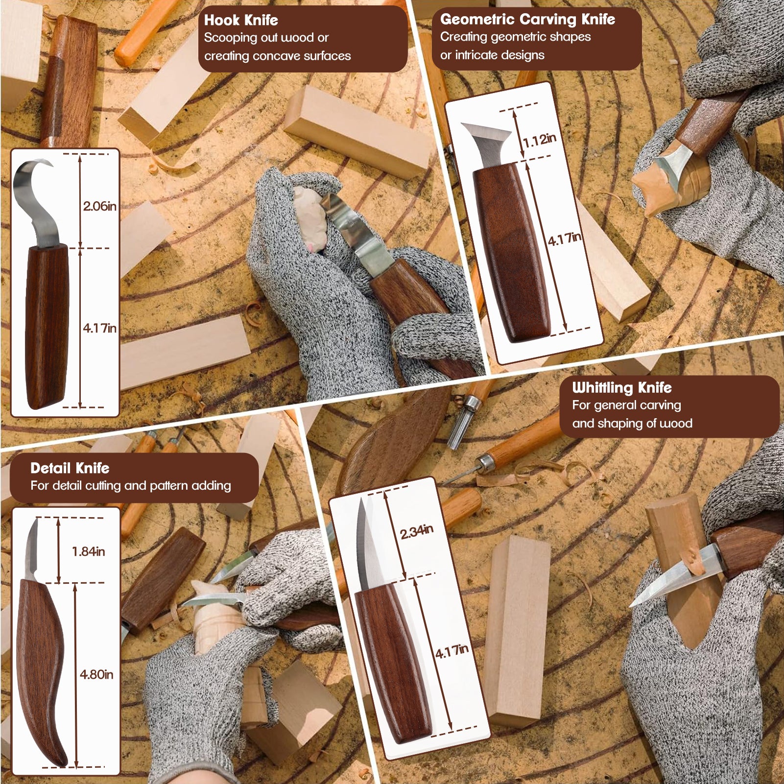 - Versatile Carving Tools: The kit includes a variety of knives such as a whittling knife, detail knife, hook knife, and geometric carving knife, suitable for different carving needs.