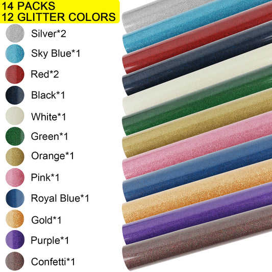 CandWuom Glitter Heat Transfer Vinyl Bundle(14 Packs)-10" x 5ft Easy to Weed Glitter htv Vinyl Bundle for T-Shirts, Easy to Cut Iron on Vinyl