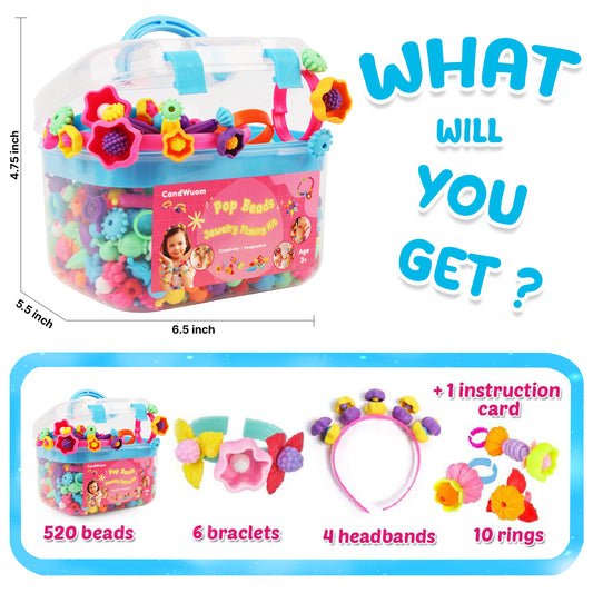 CandWuom 520+ Snap Pop Beads for Kids Jewelry Making - Toys for Girls, Arts and Crafts Supplies, Bracelet Making Crafts for Kids, Gifts for Girls Age 3-5